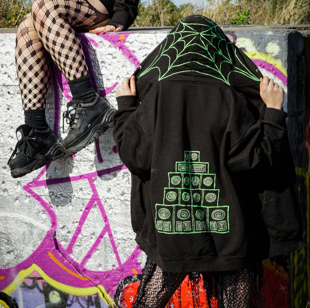 This will add an embroidered cobweb to the hood to of any item of your choice, in your custom chosen colour/s.