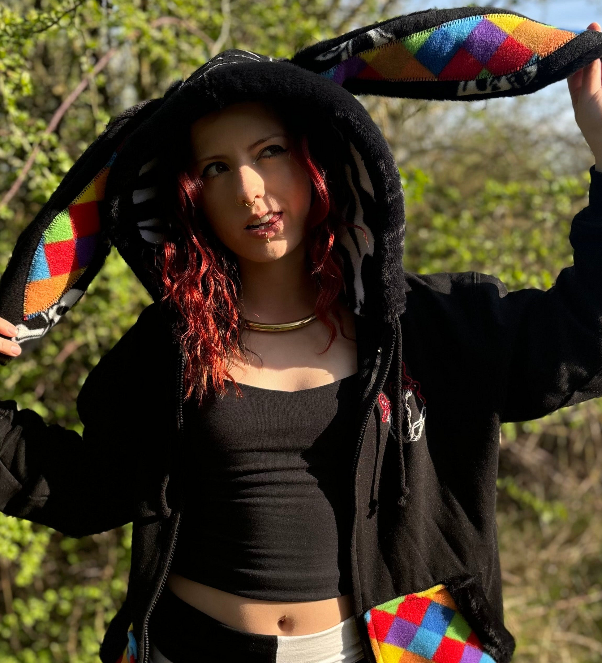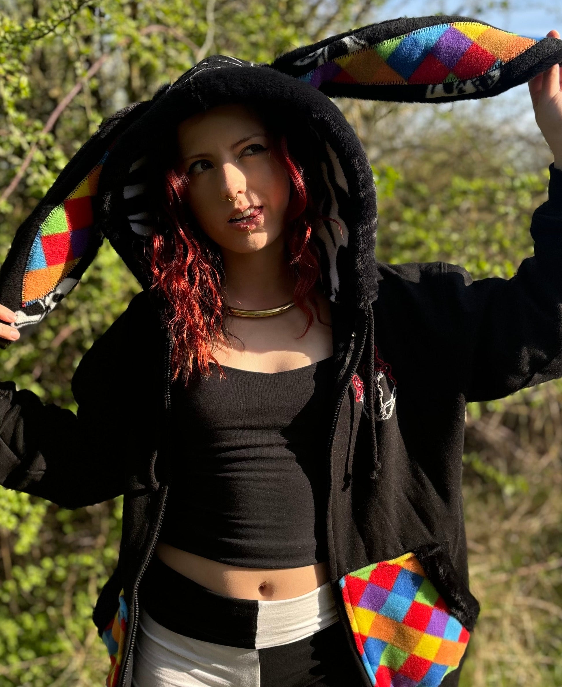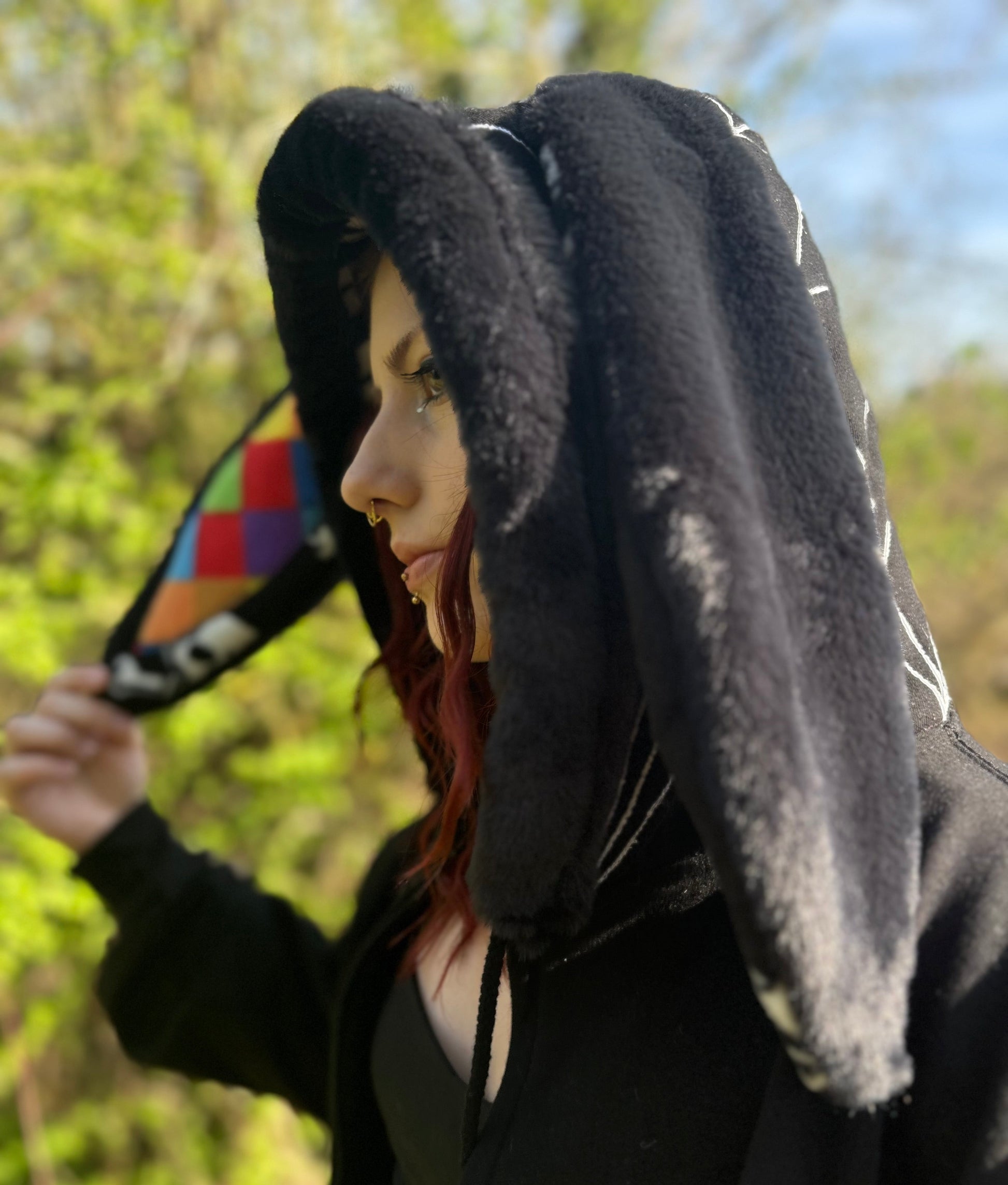For the bunny ears, you get to choose a faux fur for the outside and 2 types of fleece for the inside. (Plain black is also an option for this)