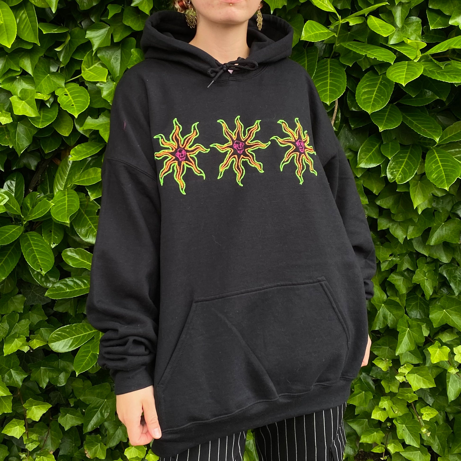 Freehand embroidered flower head hoodie.