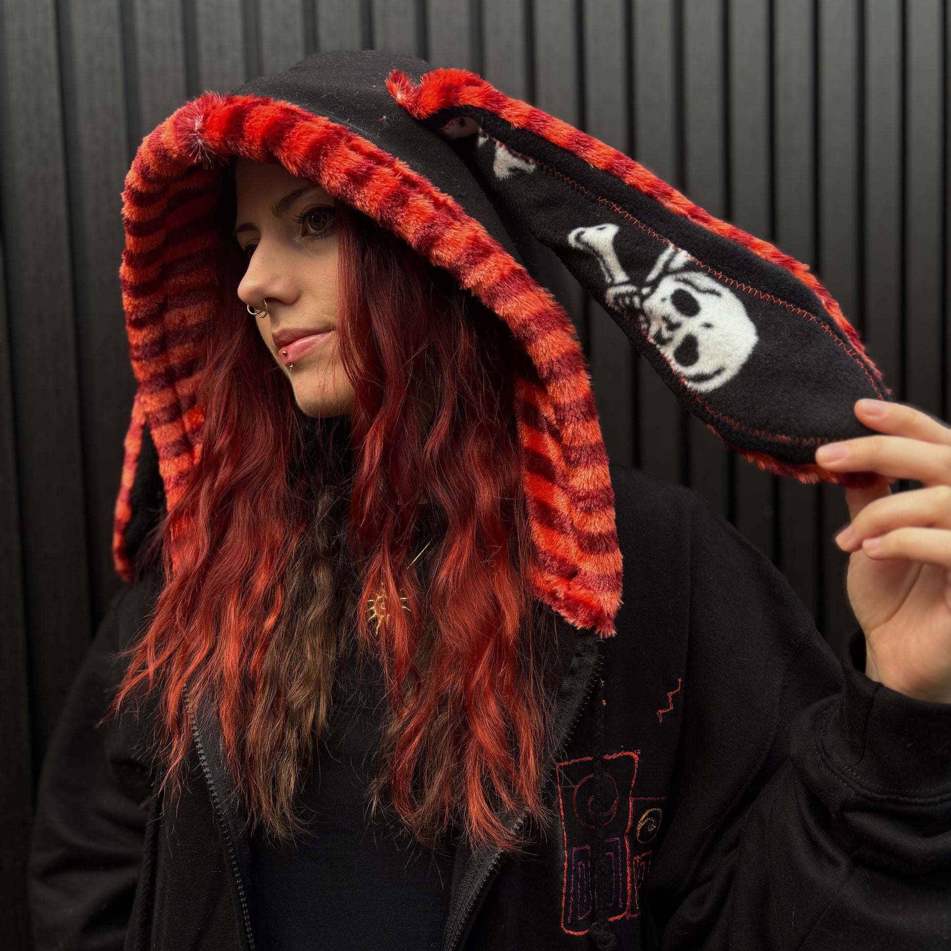 Our classic skull fleece also adorns the inside of the floppy bunny ears.